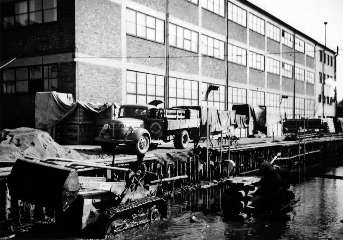 Kulvertering av Lillån framför Silfas fabriksbyggnad i kv Farkosten, efter det att Sieverts Kabelverk övertagit fabrikslokalerna hösten 1955 eller våren 1956.