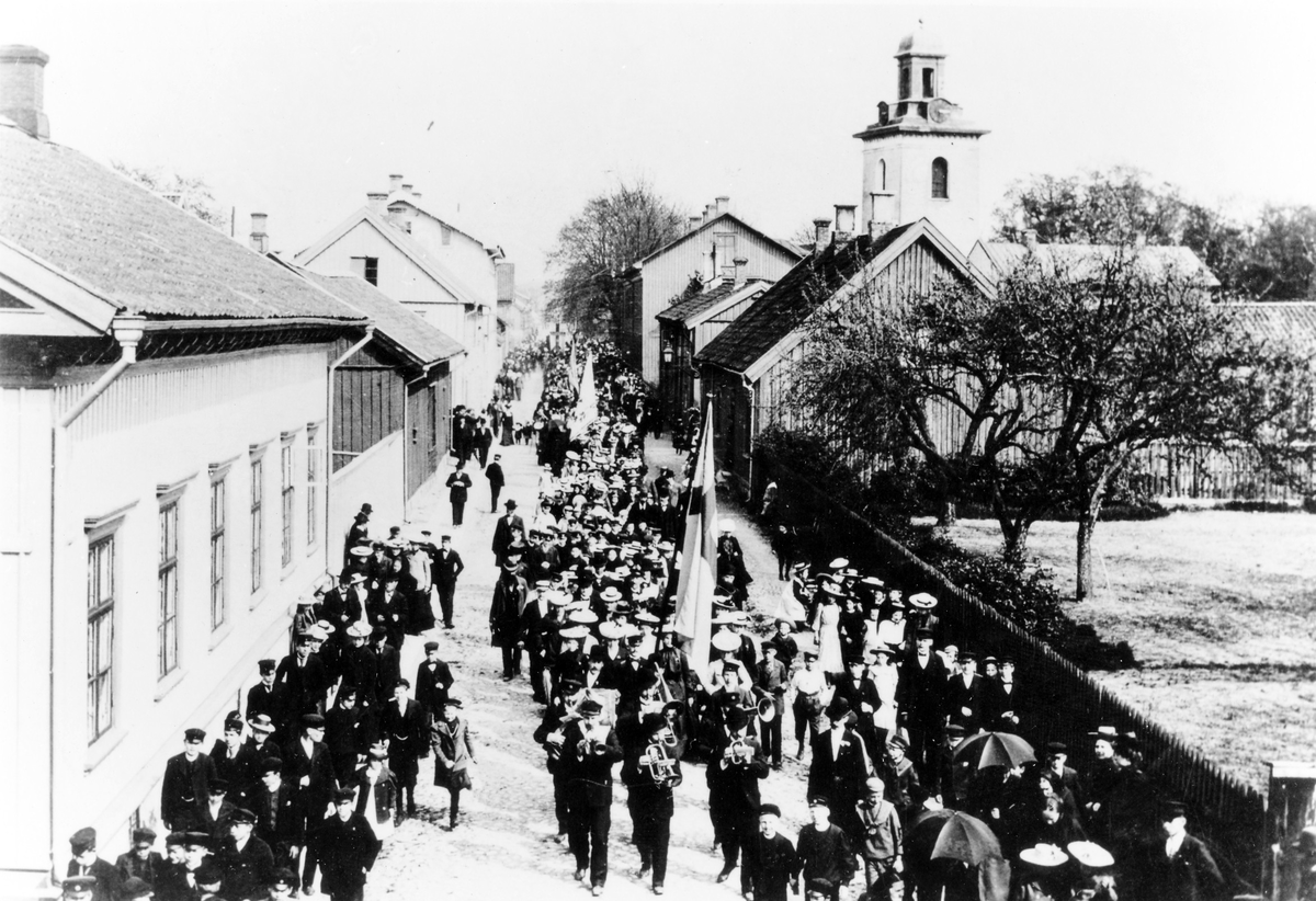 Demonstrationståg på Drottninggatan med kvarteret Alströmer till vänster.