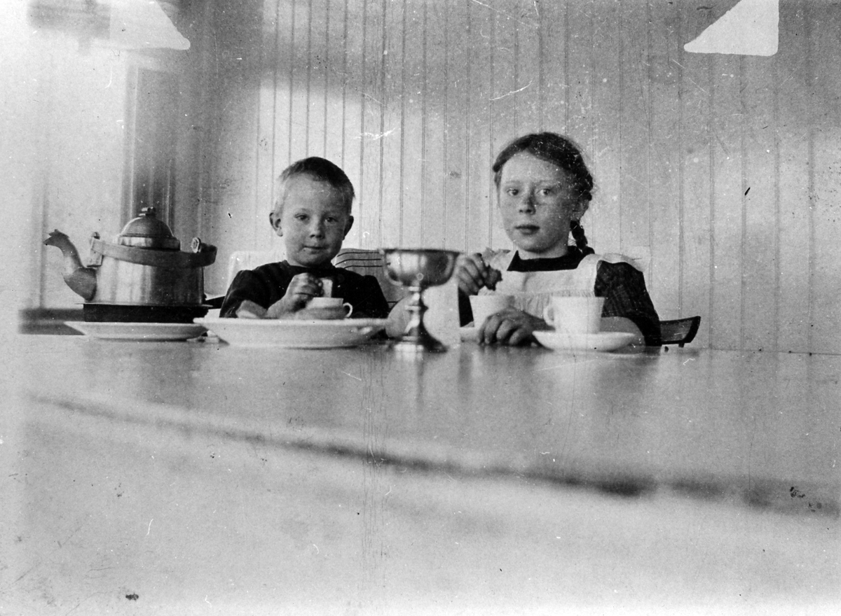 Syskonen Axel och Karin Hallberg är hemma på lunchrast från skolan. De sitter på verandan till hemmet i kv Myggan och äter.