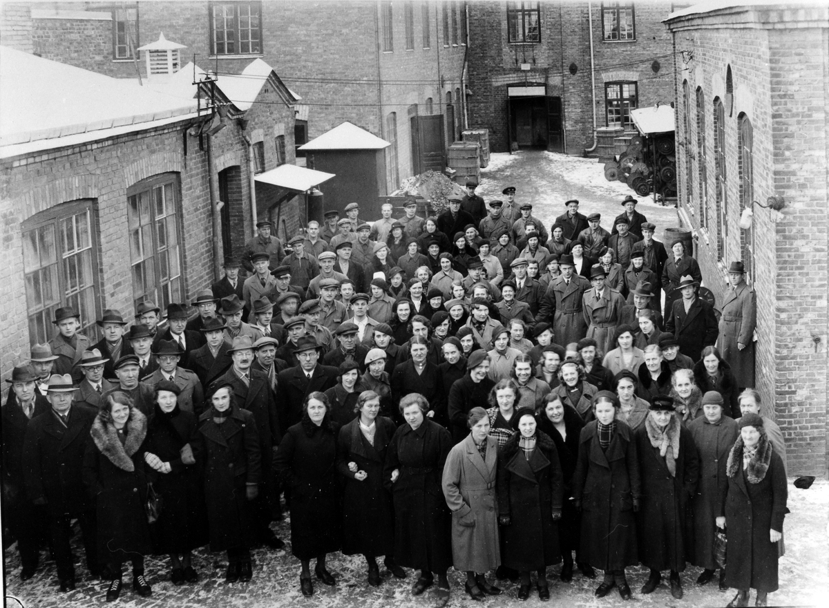 Personal på Alingsås bomullsväveri står utanför gamla fabriken i kvarteret Fliten.