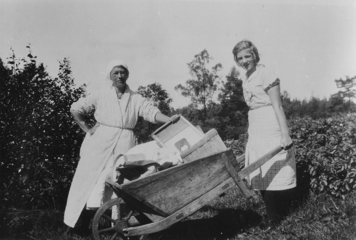 Fröken Signe och Inger Lindström, lärarinnor från Göteborg och sommargäster på Lilledalen, på väg med tvätten i en kärra tillverkad av Albin Johansson i Lilledalen. Bilden ur album som tillhört Albin Johansson.