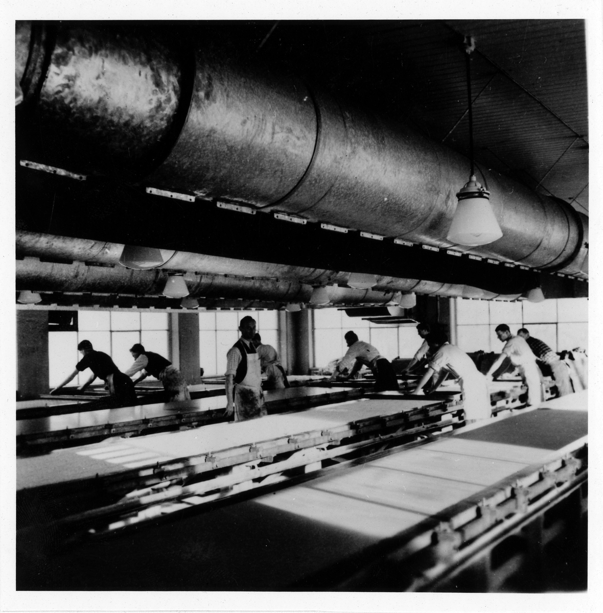 Interiörbild från SILFAs tryckeri. Vid de långa tryckborden arbetar 9 män.