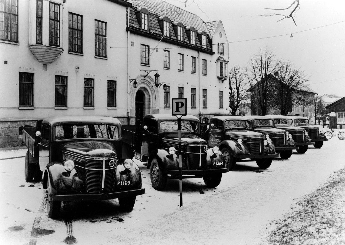 Sex Volvo-lastbilar står parkerade på rad framför Stadshotellet, idag Grand hotell. I bakgrunden skymtar Alströmerska magasinet.