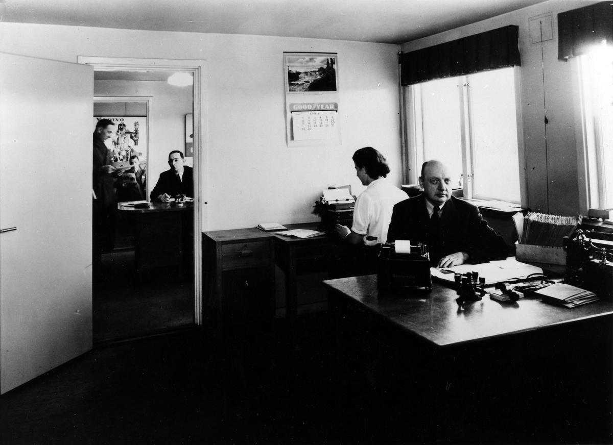 Gösta Andersson, Eric Johansson, Lisa-Britta Svensson, Frans Edström fotograferade på Alingsås Bil- och motorverkstads kontor.