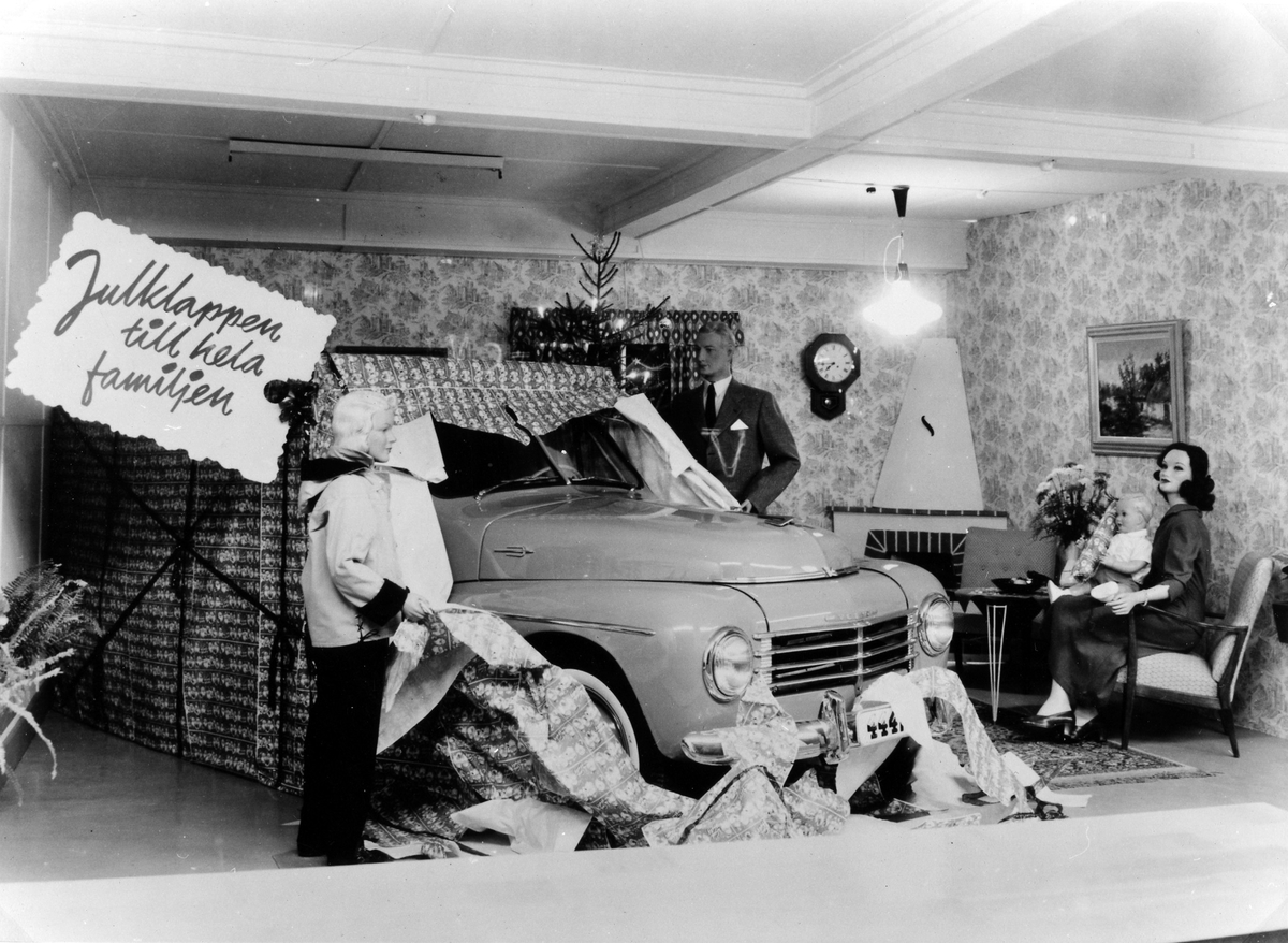 Alingsås Bil- och motorverkstads julskyltning i en, troligtvis hyrd lokal, i kv. Storken 5, ca 1955. Skyltodockor i en tidstypisk hemmamiljö, kvinna i fåtölj med barn i knäet, man som öppnat ett stort paket med inslagen volvobil och pojke som nyfiket tittar på från andra sidan.
