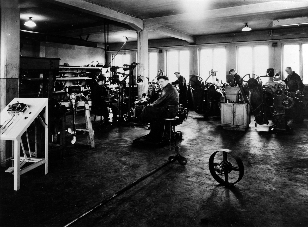 Bild tagen inifrån Alingsås Bil- och maskinverkstads maskinverkstad i kvarteret Månen 3-4. I lokalen ses 5 män som arbetar framför varsin maskin.
