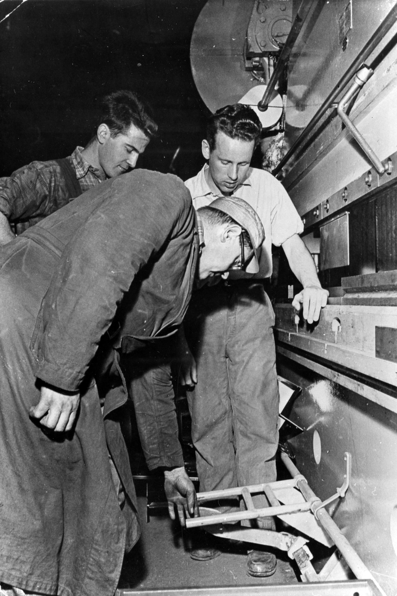 Electro-Helios. Ett skyddsombud visar en säkerhetsanordnin för två av de anställda.