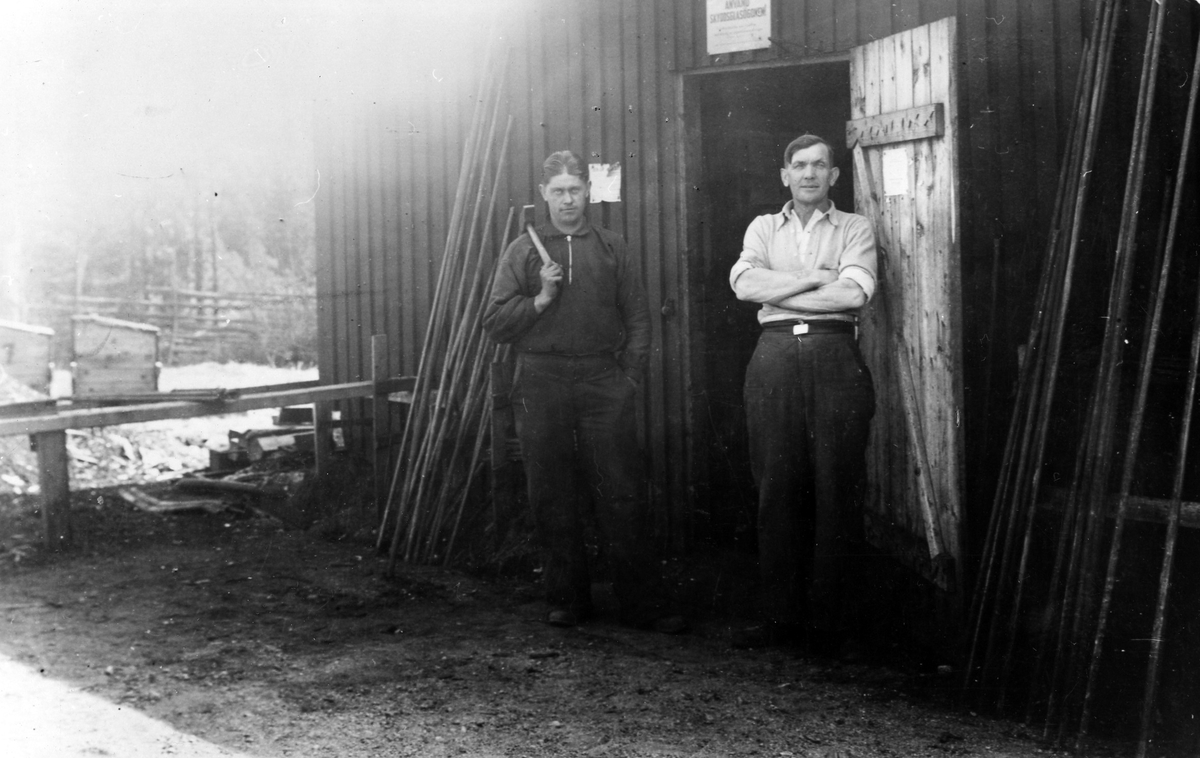 Två stycken arbetare från Statens Arbetlöshetskommision står framför ett träskjul i Fryele, Småland. Till höger står Folke Augustsson, metallarbetare från Alingsås.