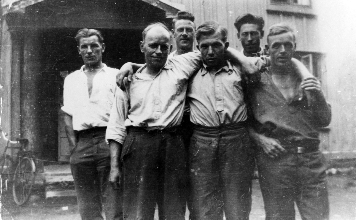 Sex män ur ett "rallaregäng" står framför en träbyggnad. Med som AK-arbetare var metallarbetaren Folke Augustsson från Alingsås.