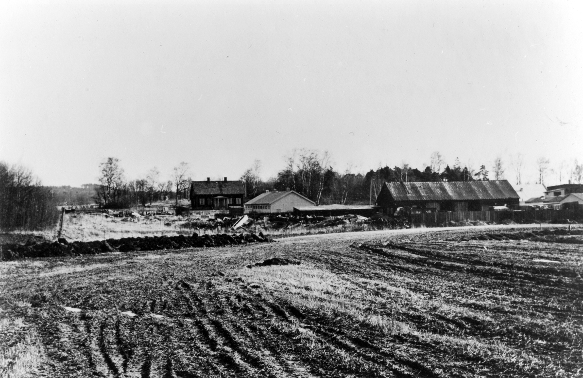 Till säteriet hörde också den långa ekonomibyggnaden (långsidan åt kameran). Den låga, ljusa byggnaden i mitten är byggd på 1960-talet och inrymde sedan Skogsbergs plåtslageri med adress Kolavägen 4. Hela gården låg i nuvarande kvarter Konfektasken.