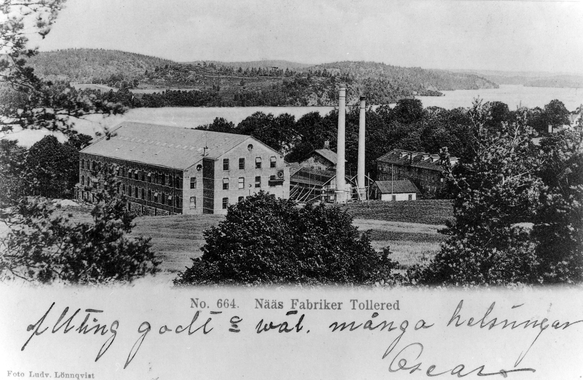 Bild tagen på ett vykortsoriginal. Distansbild på Nääs Fabrik och sjön i bakgrunden. Text skriven på vykortet "Allting godt o väl, många hälsningar Oscar".