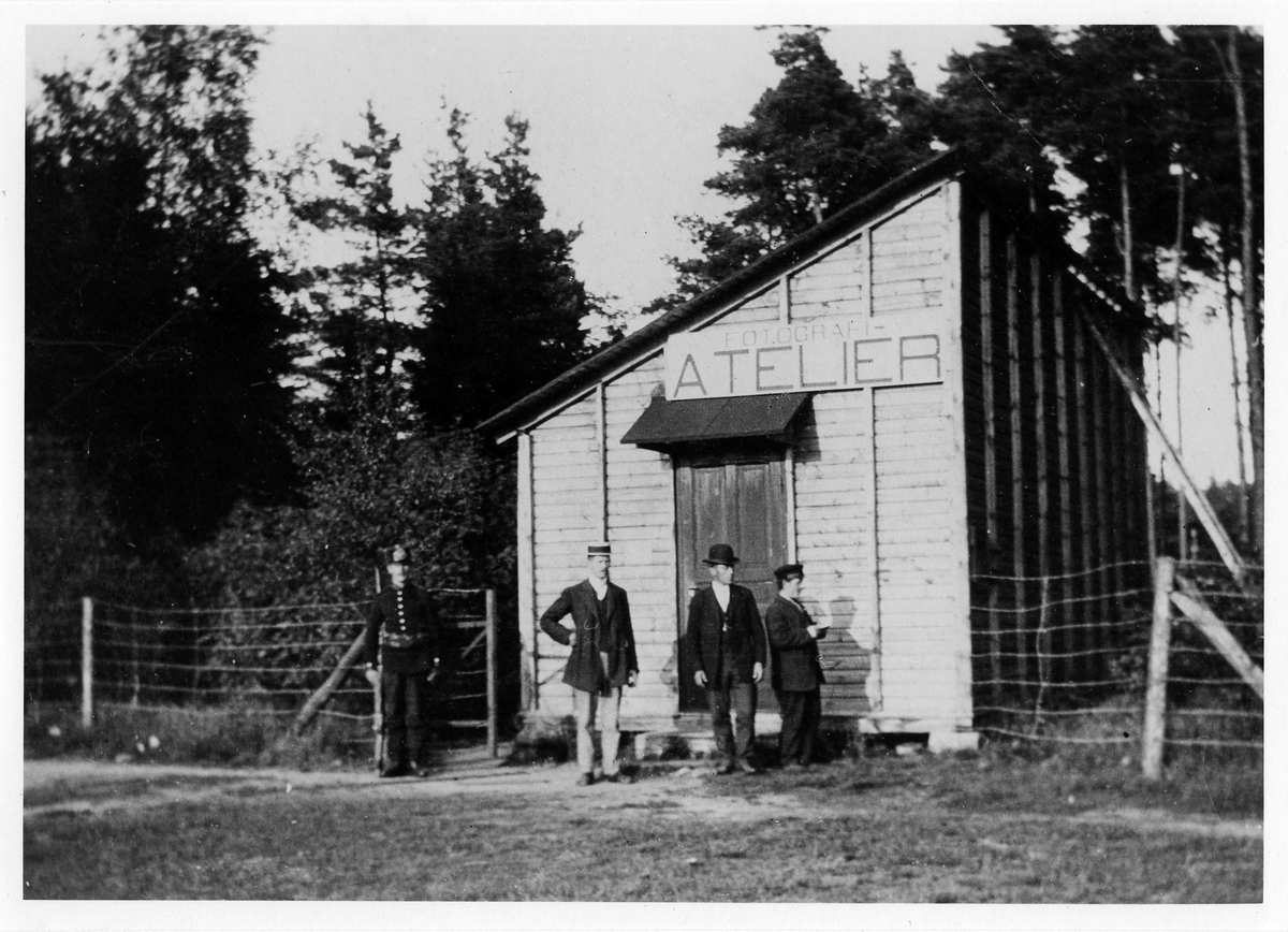 4 män i olika utstyrslar står utanför en mindre byggnad med lutande tak. Skylt ovanför dörren med text "Fotografi-Atelier". Troligen fotograf Richard Sandbergs filialateljé i Fristad hed.