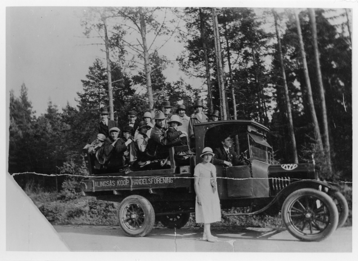 Gruppbild av 15 kvinnor och män. En man sitter i flakbilens förarsätte och en kvinna står vid sidan av, resterande 13 sitter i flaket på flakbilen. På sidan av flaket står "ALINGSÅS KOOP HANDELSFÖRENING".
