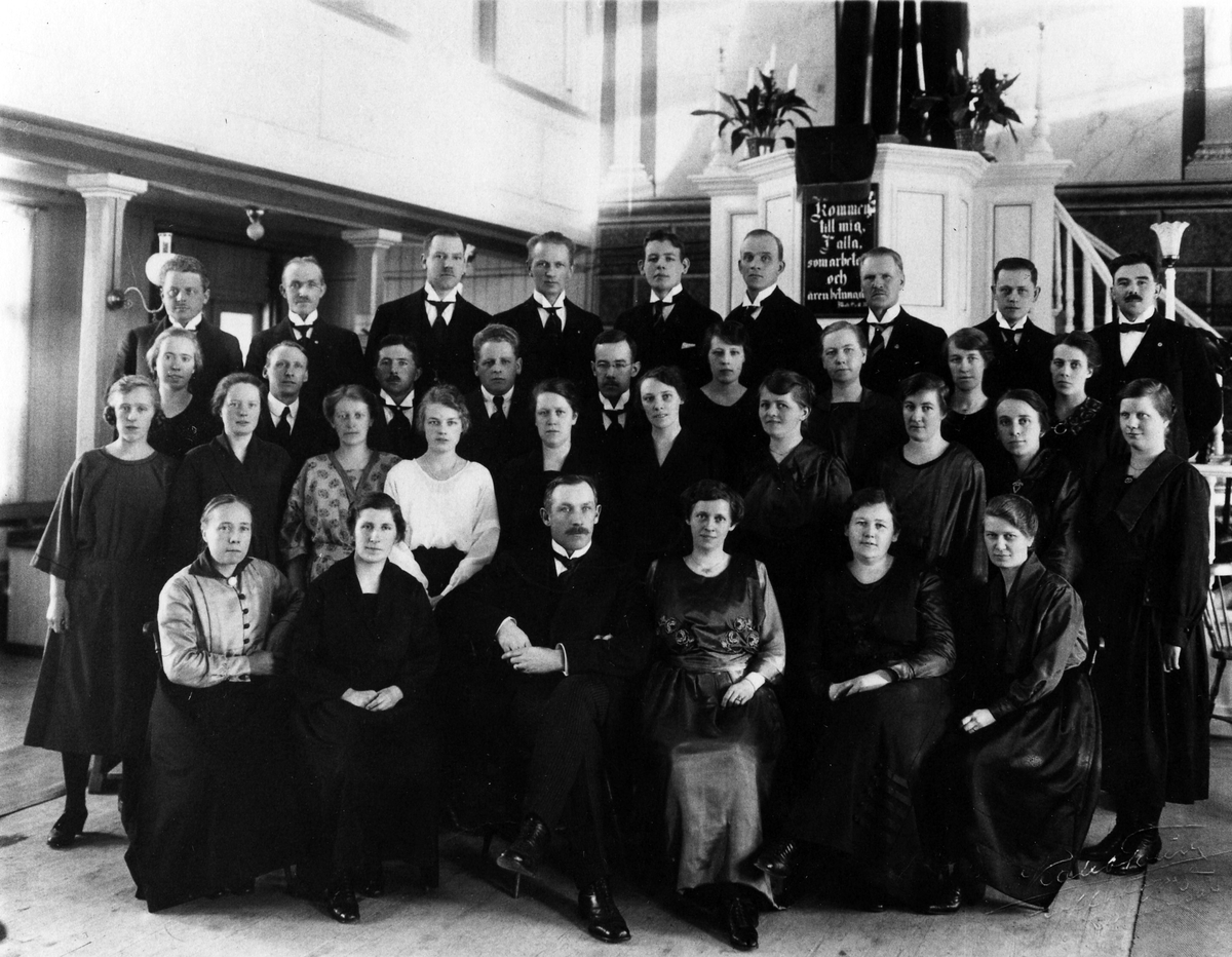 Gruppbild på 34 kvinnor och män i missionskyrkans kyrksal, stående och sittande, framför kyrkans predikstol. Under antependiet en tavla med ett bibelcitat.