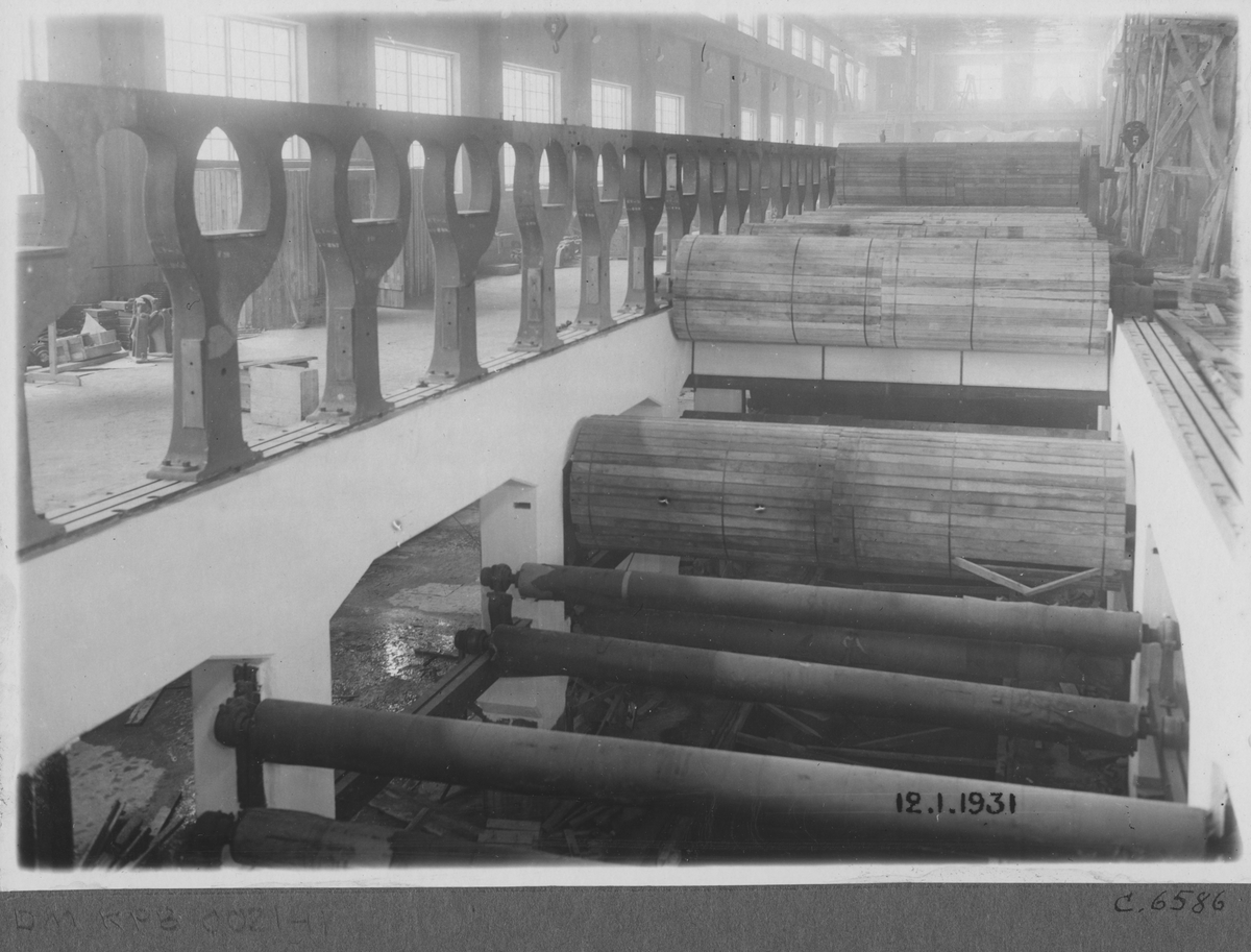Kvarnsvedens pappersbruk, C 6586. 12-1-1931. Interiör bruket, Montering av pappersmaskin, PM8
