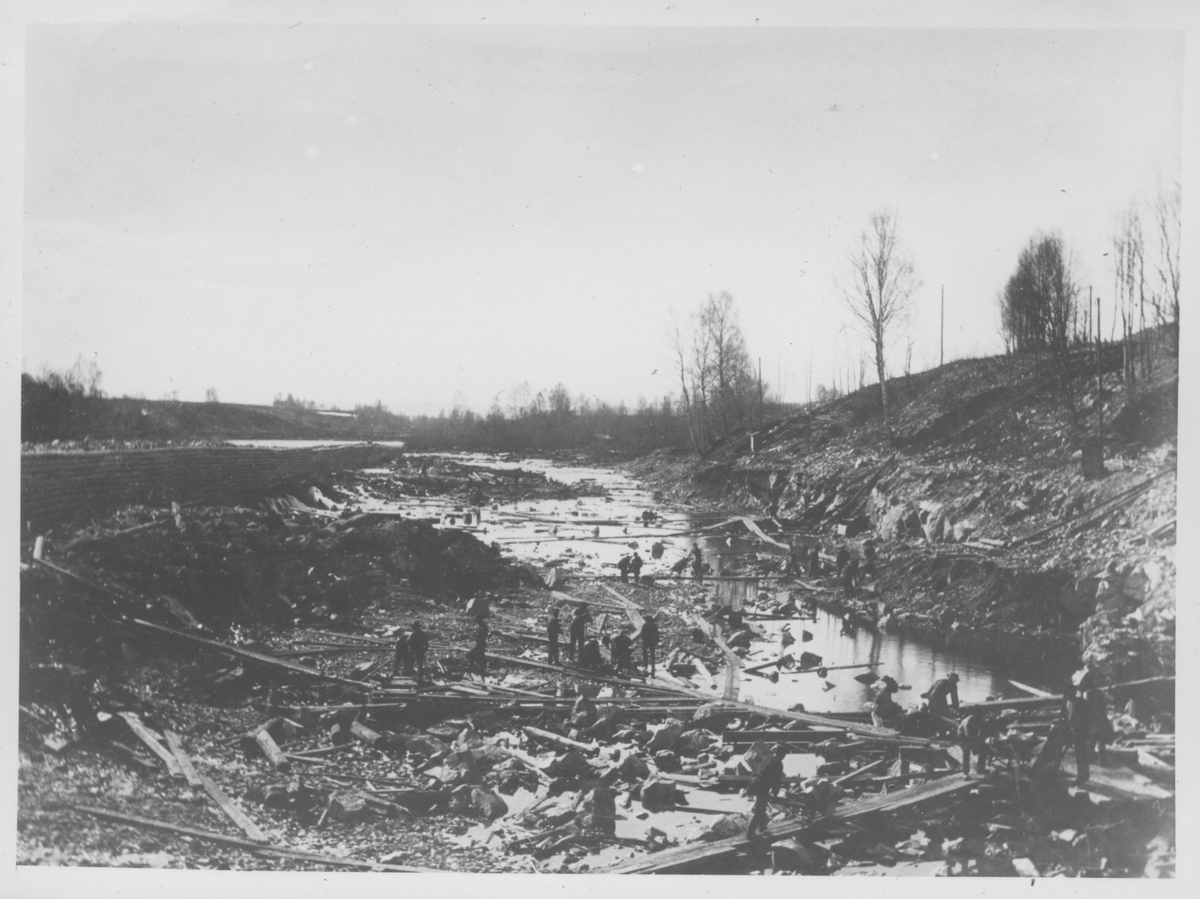 Dammen byggs 1897- Vy över dammbygget och arbetet innanför fördämningen.