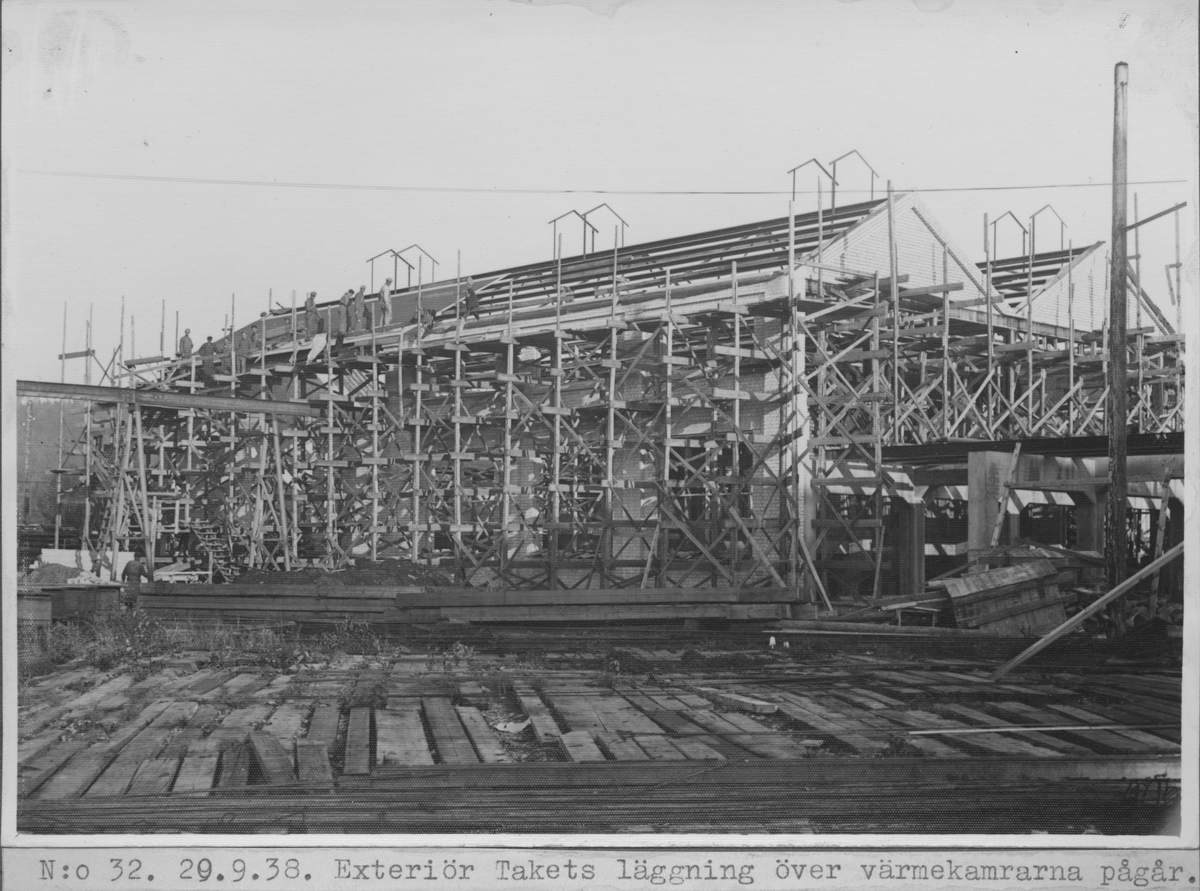 Kvarnsvedens pappersbruk. N:o 32. 29.9.38. Exteriör takets läggning över värmekamrarna pågår. D3370.
