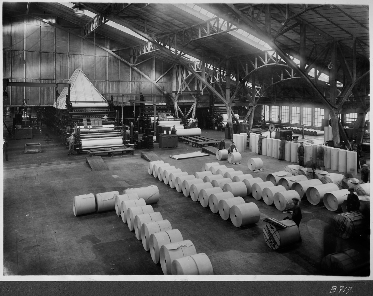 Kvarnsvedens pappersbruk, Pappersmaskin 8, byggnation del 1 och 2. Interiör bruket, pappersrullar, pappermaskin och bruksarbetare. B717