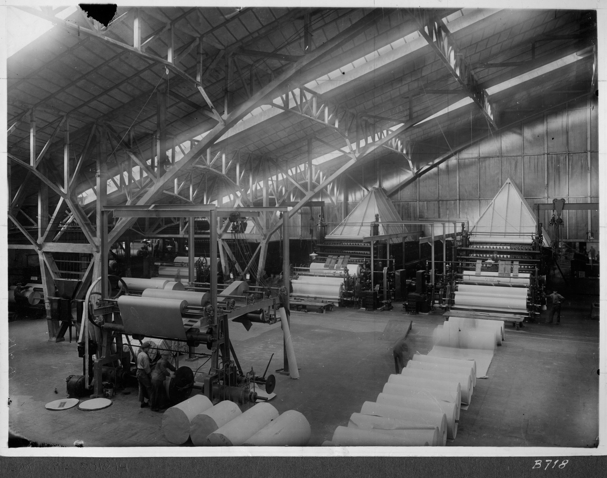 Kvarnsvedens pappersbruk, Pappersmaskin 8, byggnation del 1 och 2. Interiör bruket, pappersrullar, pappermaskin och bruksarbetare. B718