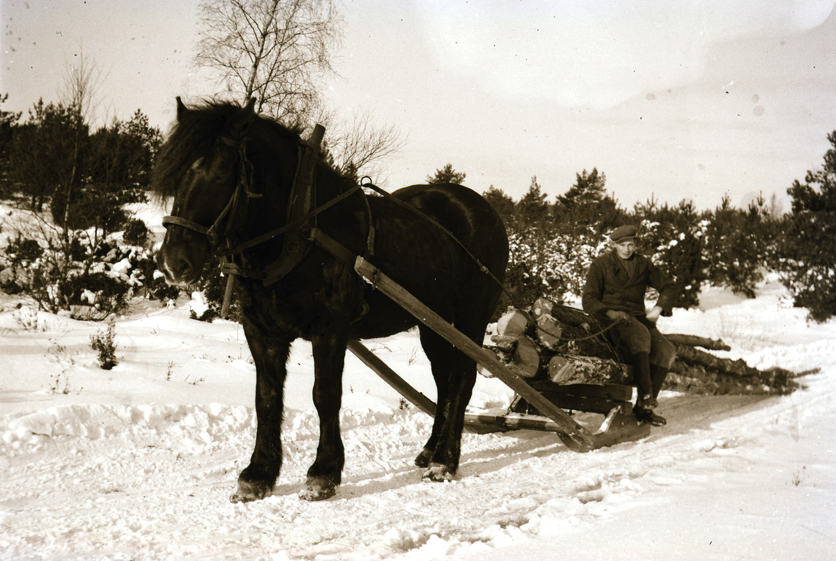 Snyggs Karl bakom hästen på ett lass med stockar i snön.