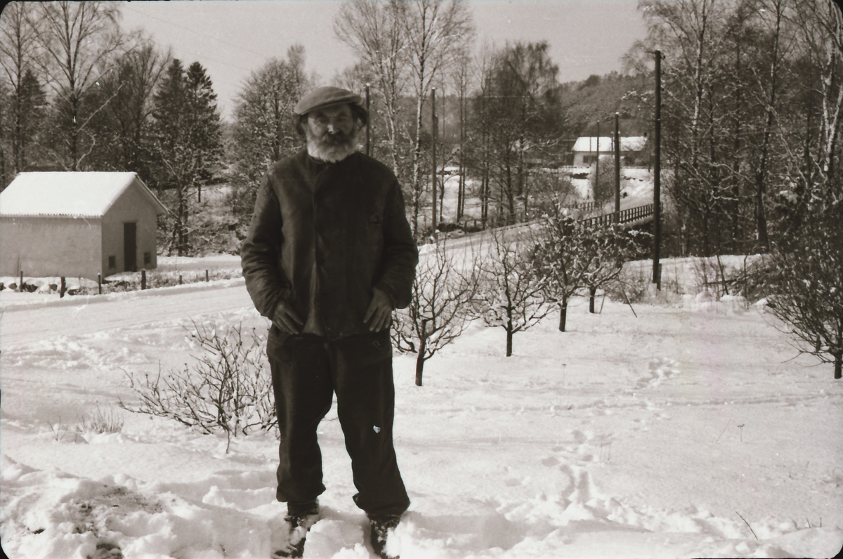 Erik "Kloar-Erik" Andersson på äldre dagar i stort skägg, står utanför affären i Veddige som kallades Filialen. Längs vägen bakom honom breder vinterlandskapet ut sig.