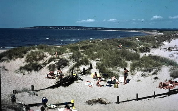 Vikens havsbad, Villshärad. Färg. Strandvy med solande och badande människor bland sanddynerna med havet i bakgrunden.