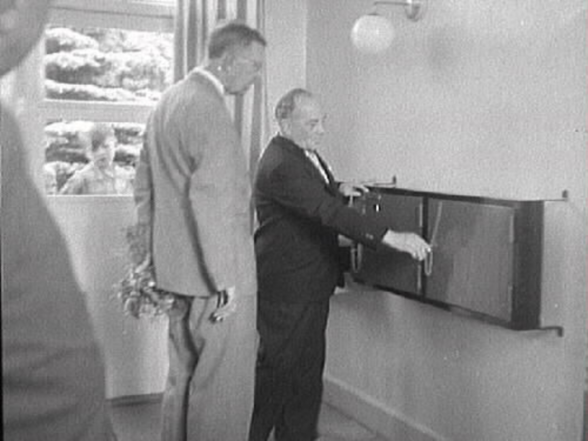 Kungabesök. Doktor Albert Ahlberg guidar kung Gustaf VI Adolf, på Kustsanatoriet Apelviken/Apelvikens sjukhus. Artikel i samband med bilderna publicerad i Varbergs Tidning 1954-06-23.