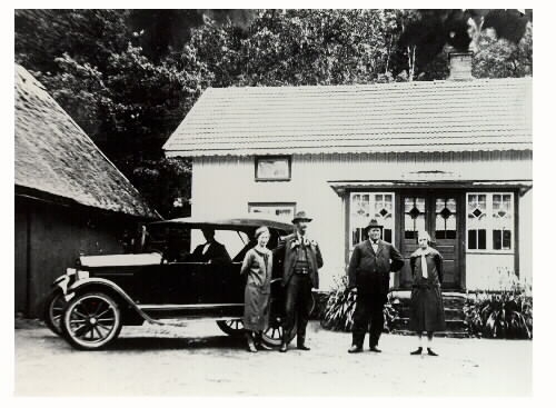 "Karl Emanuelsson med sin första bil på Johan Emanuelssons gårdsplan i Drared, Veddige 1926." En man sitter i bilden och vid den står två kvinnor och två män. Bostadshuset har en glasveranda.