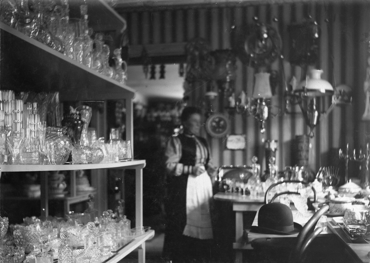 "Kristallrummet" i Linda Hansons Bosättningsaffär med Linda i bakgrunden. Hyllorna är fyllda med karaffer, vaser, skålar och andra glasvaror. På bordet till höger ligger en kubbhatt och i bakgrunden hänger fotogenlampor.