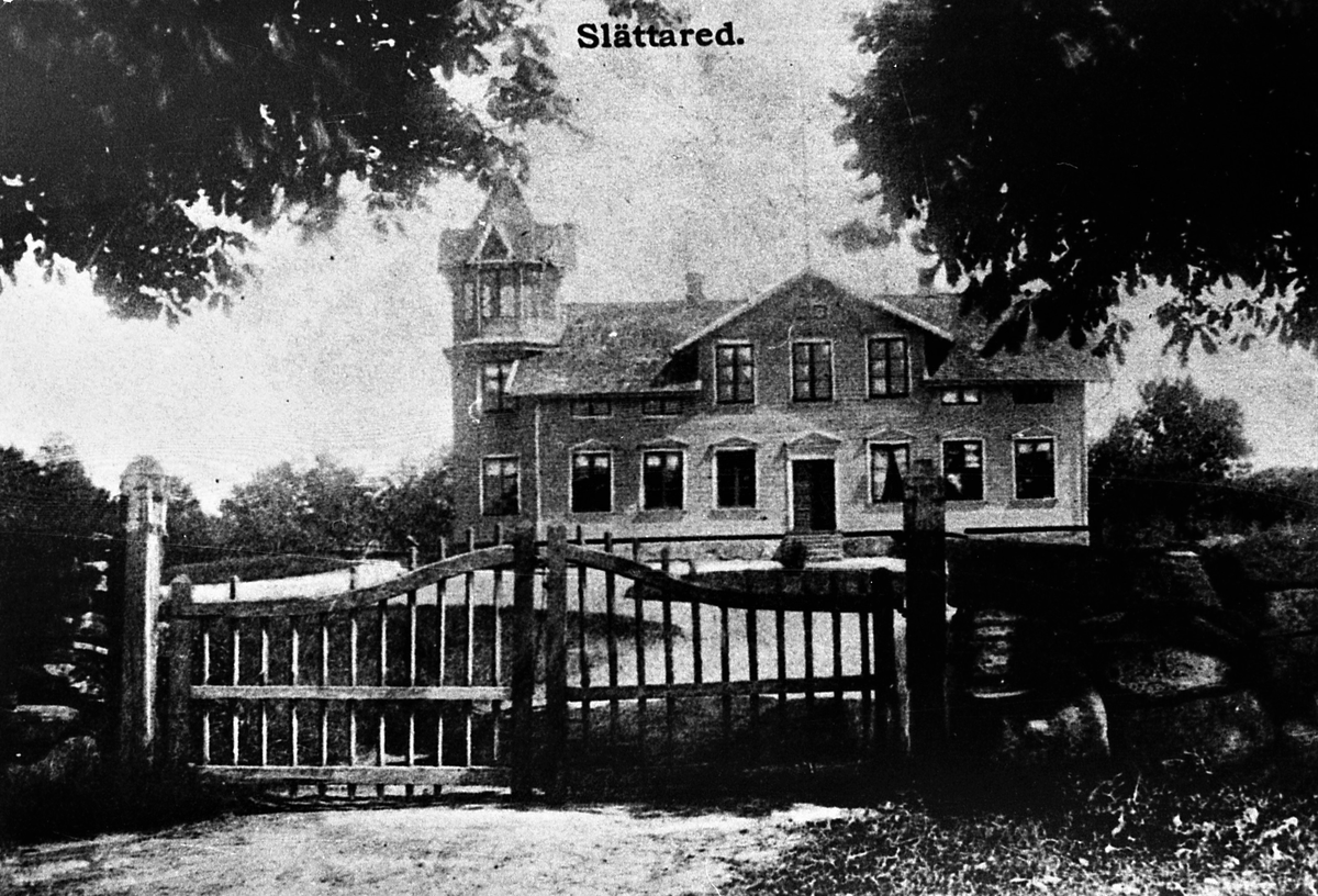 Vykort, "Slättared". Det har förmodats vara en felstavning då kortet har lämnats in till en bildtävling att föreställa "Stättareds gård, mangårdsbyggnad." Byggnaden har ett torn vid ena gaveln och i förgrunden leder en grind in till tomten. Där Stättared ligger idag låg förr tre gårdar tätt samman. Dessa köptes 1868 av en inspektor vid namn Norén som rev två av dem med en gång och på långfredagen 1875 brann även det sista boningshuset ner.
