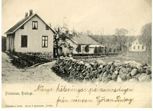 Brevkort, "Folkskolan i Hvalinge." Kortet är avsänt 1904 och visar tre byggnader och byvägen, kantad av en stengärdsgård, som delar sig.
