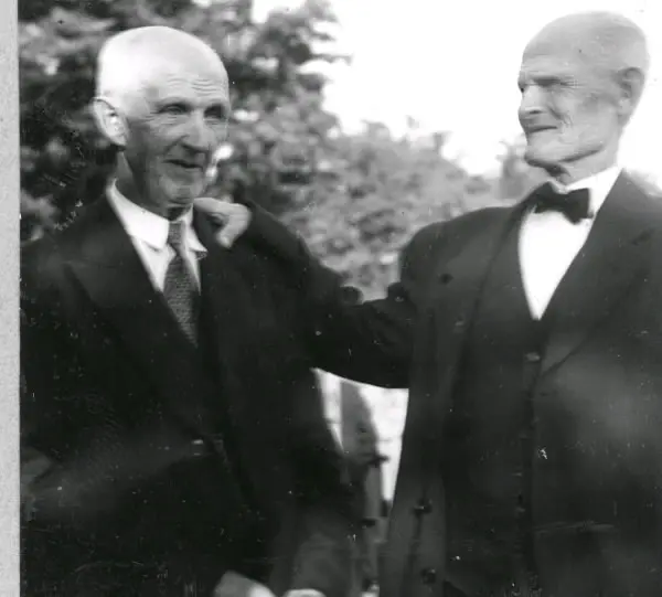 Från folkskolan i Åhs. Bilden hör samman med artikeln i Hallands Nyheter, 1944-08-09, "Från skoljubileet i Tvååker: Rottingen i lärarens hand ett erkänt uppfostringsmedel". Bildtext: "Några elever i samspråk". T v okänd, t h Joh. Johansson. Tillhör samlingen med fotokopior från Hallands Nyheter som är från 1930-1940-talen."