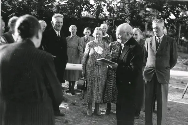 Från folkskolan i Åhs. Kvinnor och män står utomhus och lyssnar på mannen med uppslagen bok till höger, läraren Reinhold Linder. Bilden hör samman med artikeln i Hallands Nyheter, 1944-08-09, "Från skoljubileet i Tvååker: Rottingen i lärarens hand ett erkänt uppfostringsmedel". Tillhör samlingen med fotokopior från Hallands Nyheter som är från 1930-1940-talen.