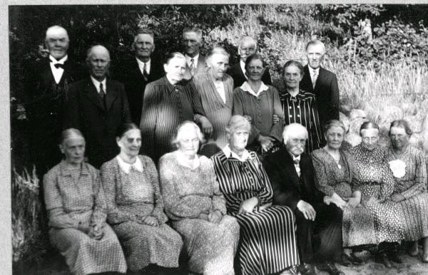 Från folkskolan i Åhs. Deltagare vid skolans jubileum, där läraren Reinhold Linder sitter med kvinnorna nedtill. Bilden hör samman med artikeln i Hallands Nyheter, 1944-08-09, "Från skoljubileet i Tvååker: Rottingen i lärarens hand ett erkänt uppfostringsmedel". Tillhör samlingen med fotokopior från Hallands Nyheter som är från 1930-1940-talen."