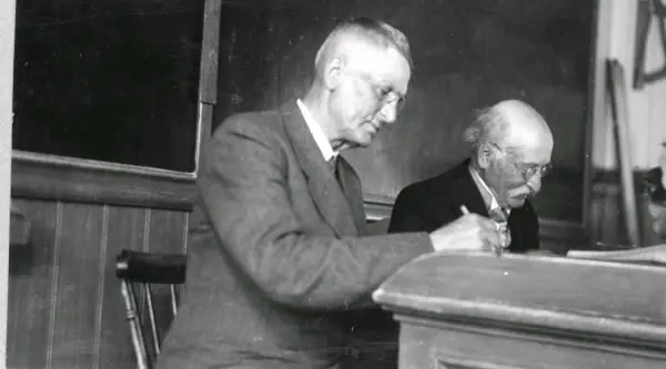 "Johan Alfred Johansson och Reinhold Linder. Från folkskolan i Åhs. Bilden hör samman med artikeln i Hallands Nyheter, 1944-08-09, "Från skoljubileet i Tvååker: Rottingen i lärarens hand ett erkänt uppfostringsmedel". Bildtext: "Folkskoll. Linder förrättar upprop, närmast intill honom sekr. Joh. Alfr Larsson." Olika efternamn anges alltså till Johan Alfred. Tillhör samlingen med fotokopior från Hallands Nyheter som är från 1930-1940-talen.