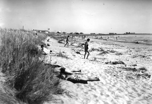 Olofsbo Havsbad, strandvy med badande och solande människor. Förlag: Pilängens Livsmedel, Olofsbo Havsbad.