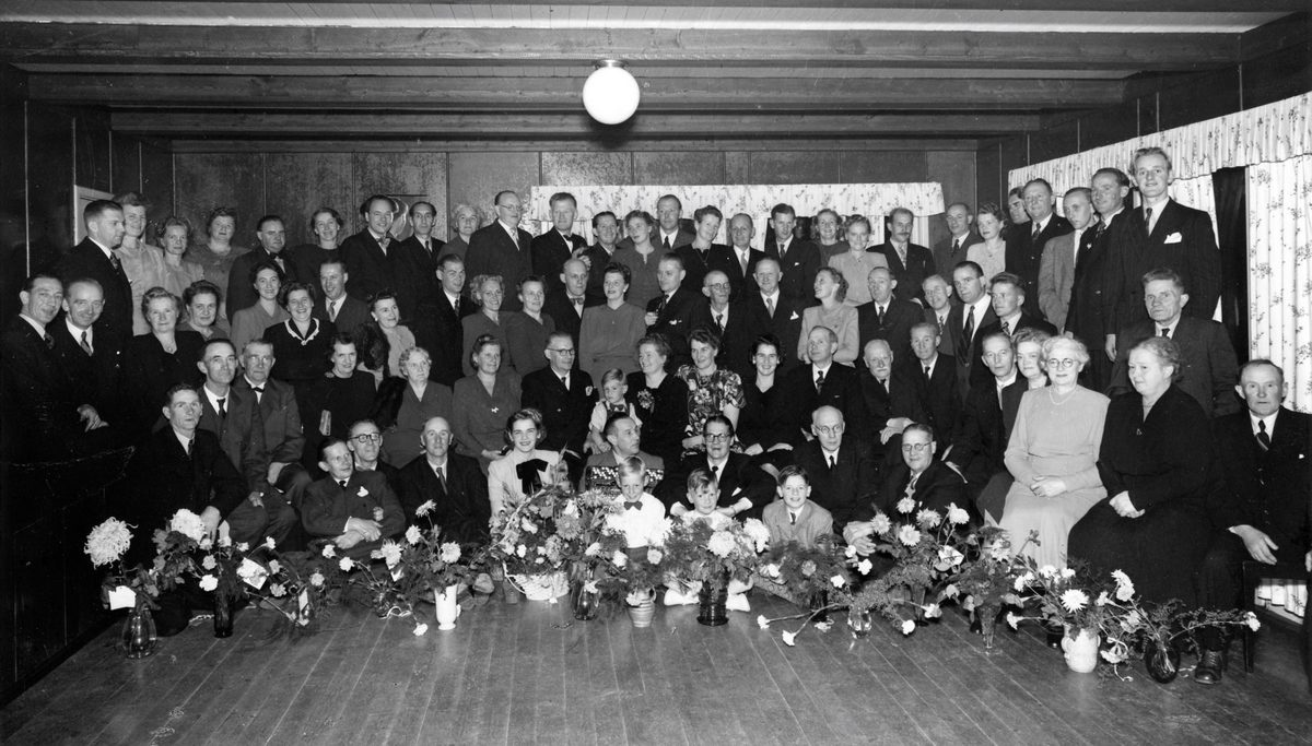 Gruppbild av personalen på Kustsanatoriet Apelviken i samband med dess 50-årsjubileum den 3 juli 1954. Framtill har en mängd blombuketter ställts fram och bakom de tre små gossarna i mitten sitter en man med dragspel. Mannen som sitter längst till höger var svinskötaren Sven, som dog samma år och blev jordfäst på sanatoriets begravningsplats.