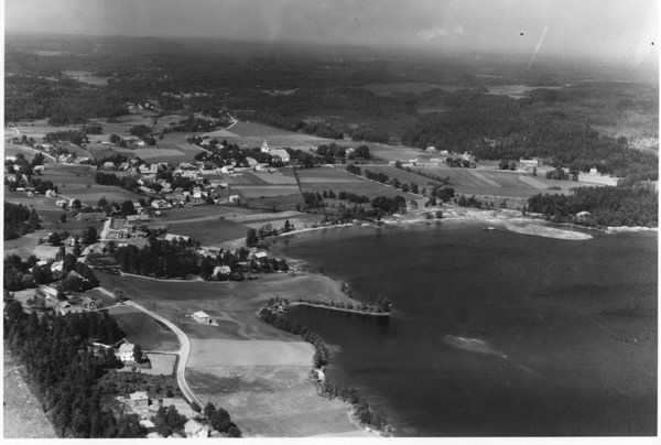 Flygfoto över Södra Unnaryd. Från sjön Unnen sträcker sig bebyggelsen längs vägarna i odlingslandskapet. Längre bort tar skogsområden vid.