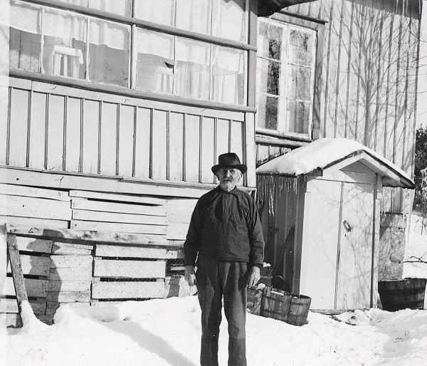 Text med bilden: "Örmanäs Åsa 90 år d 27/2". Uppgifter i övrigt saknas. En man står vid glasverandan till ett bostadshus. Bakom honom ses en liten utbyggnad, troligen till källarnedgången. Tillhör samlingen med fotokopior från Hallands Nyheter som är från 1930-1940-talen.