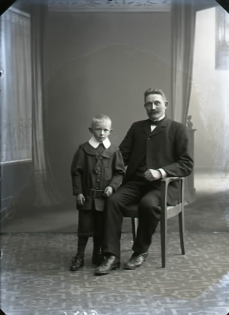 Familjebild, far och son i helfigur där fadern sitter. Ateljébild. Beställare: J A Johansson, Åsa.