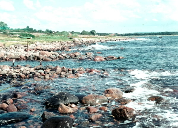 Kolorerat foto med vy längs en stenig strandkant, eventuellt med båtkåsa i förgrunden. En båtkåsa är en gammaldags tilläggningsplats för båtar bestående av två låga stenmurar där båtarna låg skyddade mot väder och vind. Några båtar ligger uppdragna på stranden.