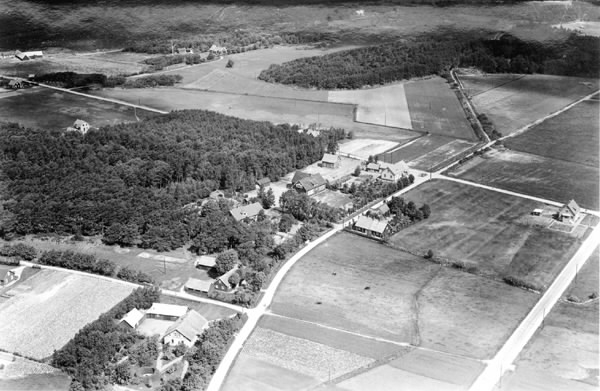 "Flygfoto över Ugglarp, Slöinge." Lantgårdar i skogssprängt odlingslandskap.