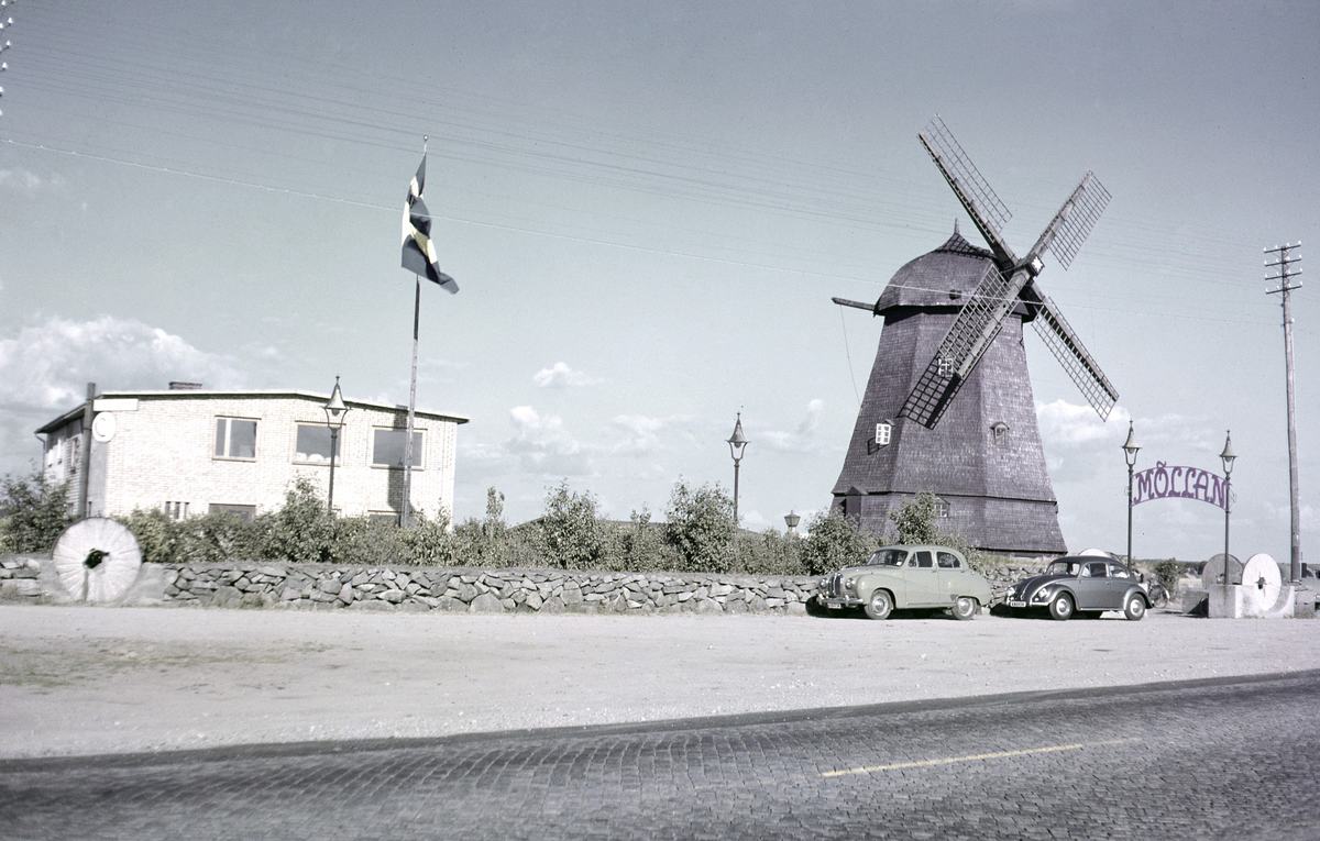 Exteriörbild. Restaurang Möllan i Morup. Vid kvarnen drevs både boende och restaurang. Entrén mellan lyktstolparna flankeras av kvarnhjul och där står två bilar parkerade; de ena är en "folkabubbla". Tvärs över bilden går telefonledningar.