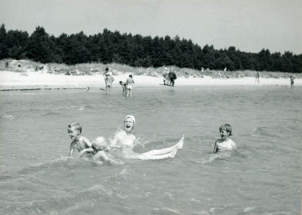 Familjen Erikssons tältsemestrar med bil på 1950- och 1960-talet. Bad i Sudersand på Fårö, Gotland 1959. På bilden mamma Gun-Britt, Thomas, Björn och Bodil.