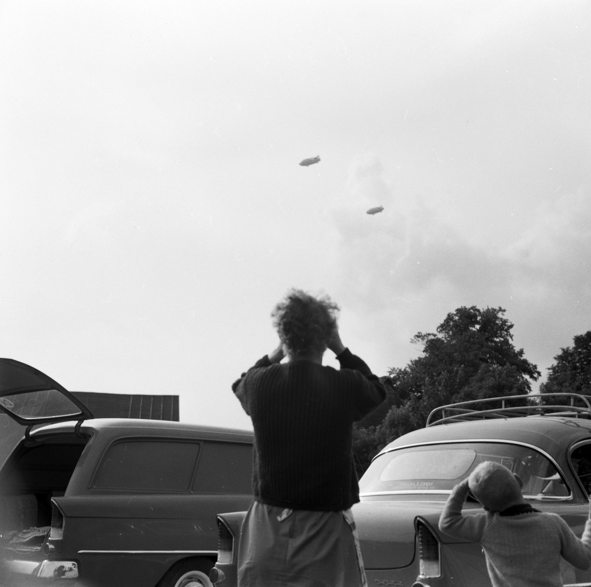 Familjen Erikssons tältsemestrar med bil på 1950- och 1960-talet. På campingplatsen utanför Hamburg, Tyskland 1962. Mamma Gun-Britt och Thomas står och tittar på Zeppelinare som flyger över Hamburg.