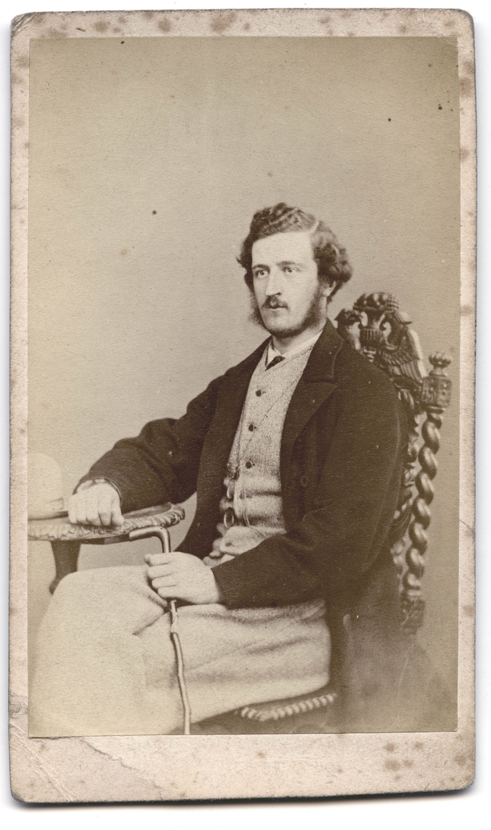 Porträtt på en man i helfigur, sittande.