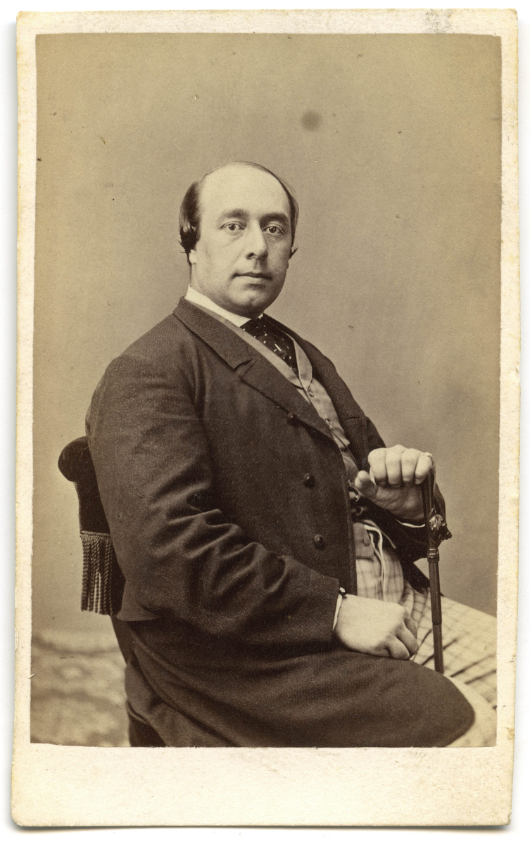Porträtt på en man i helfigur, sittande.