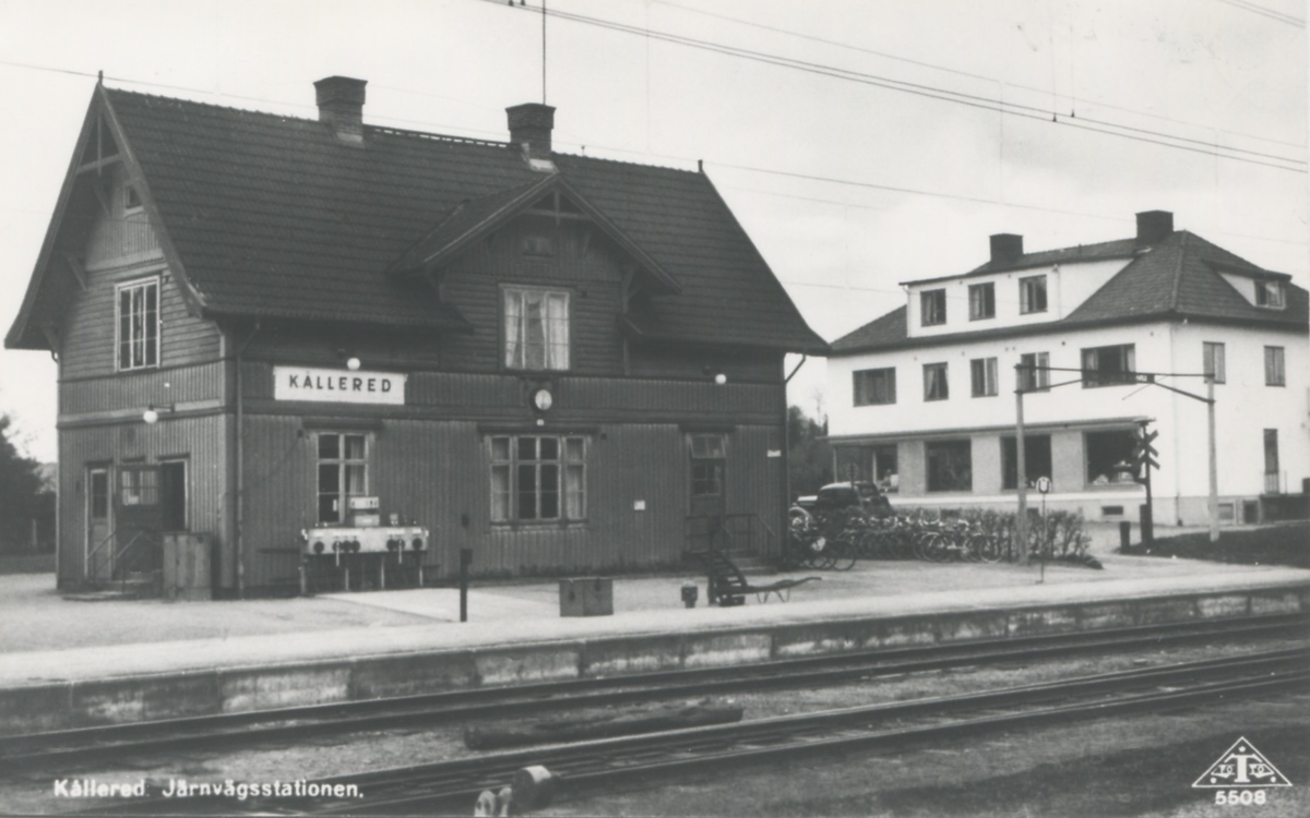Avfotograferat vykort "Kållered Järnvägsstationen" 1950-tal. Till höger ses Svenssons affärshus och villa. I förgrunden ses järnvägsspår.