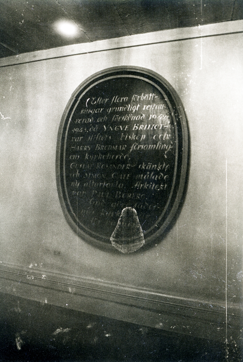 Inskription: "Efter flera förbättringar grundligt restaurerad och förskönad 1942-1943 då Yngve Brecht var stiftets biskop och Harry Brodmar församlingens kyrkoherde.