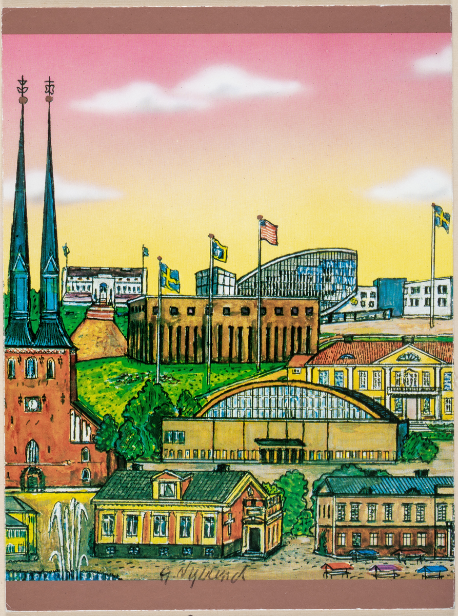 Stadsvy med bl a domkyrkan, Smålands museum, Utvandrarnas hus, tennishallen m.fl. byggnader.